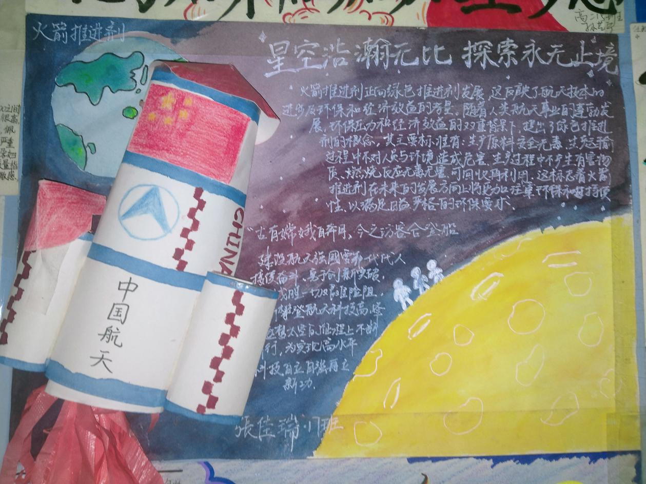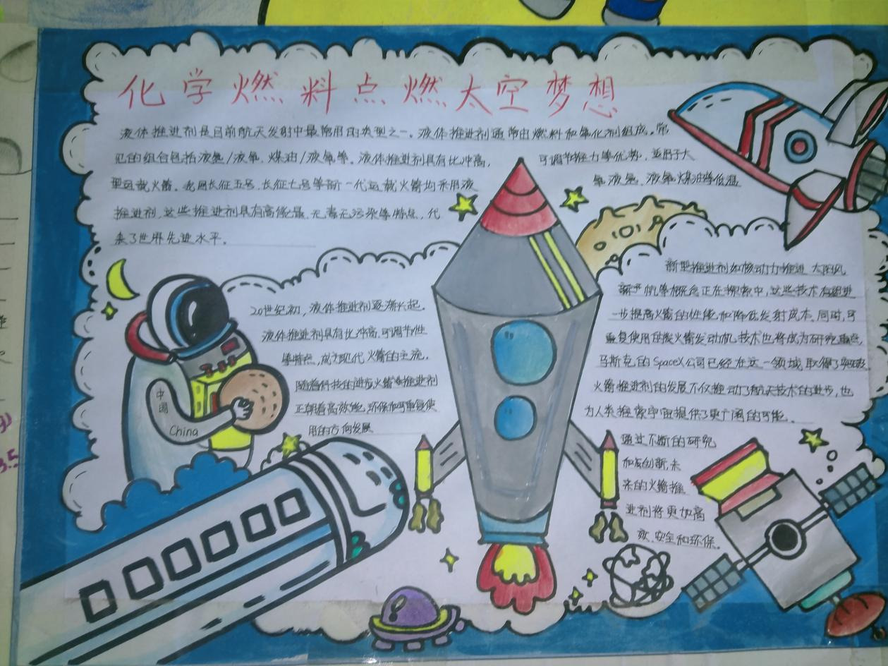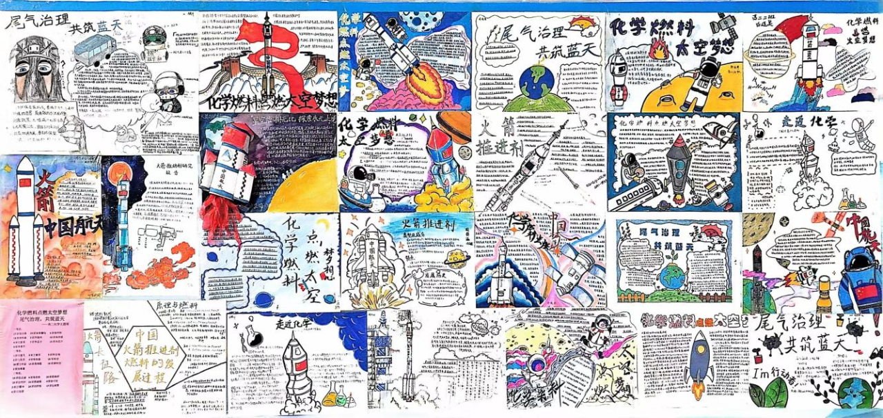 为落实化学学科核心素养,帮助学生更好的将学科知识与生活实际联系起来,调动学生学习的积极主动性,激发学生的学习兴趣。高二年级化学组成功举办了以 “化学燃料点燃太空梦想”和“尾气治理,共筑蓝天”为主题的手抄报活动。